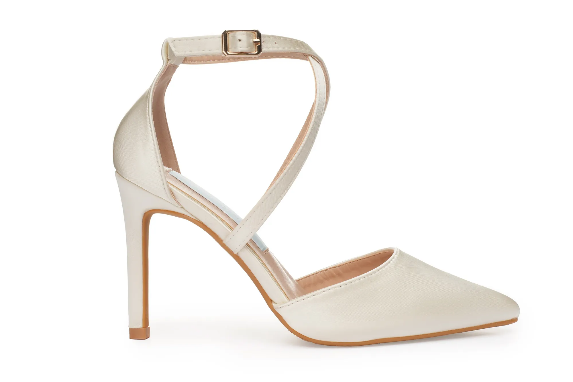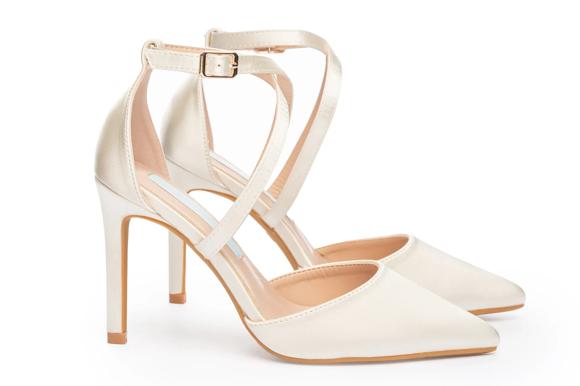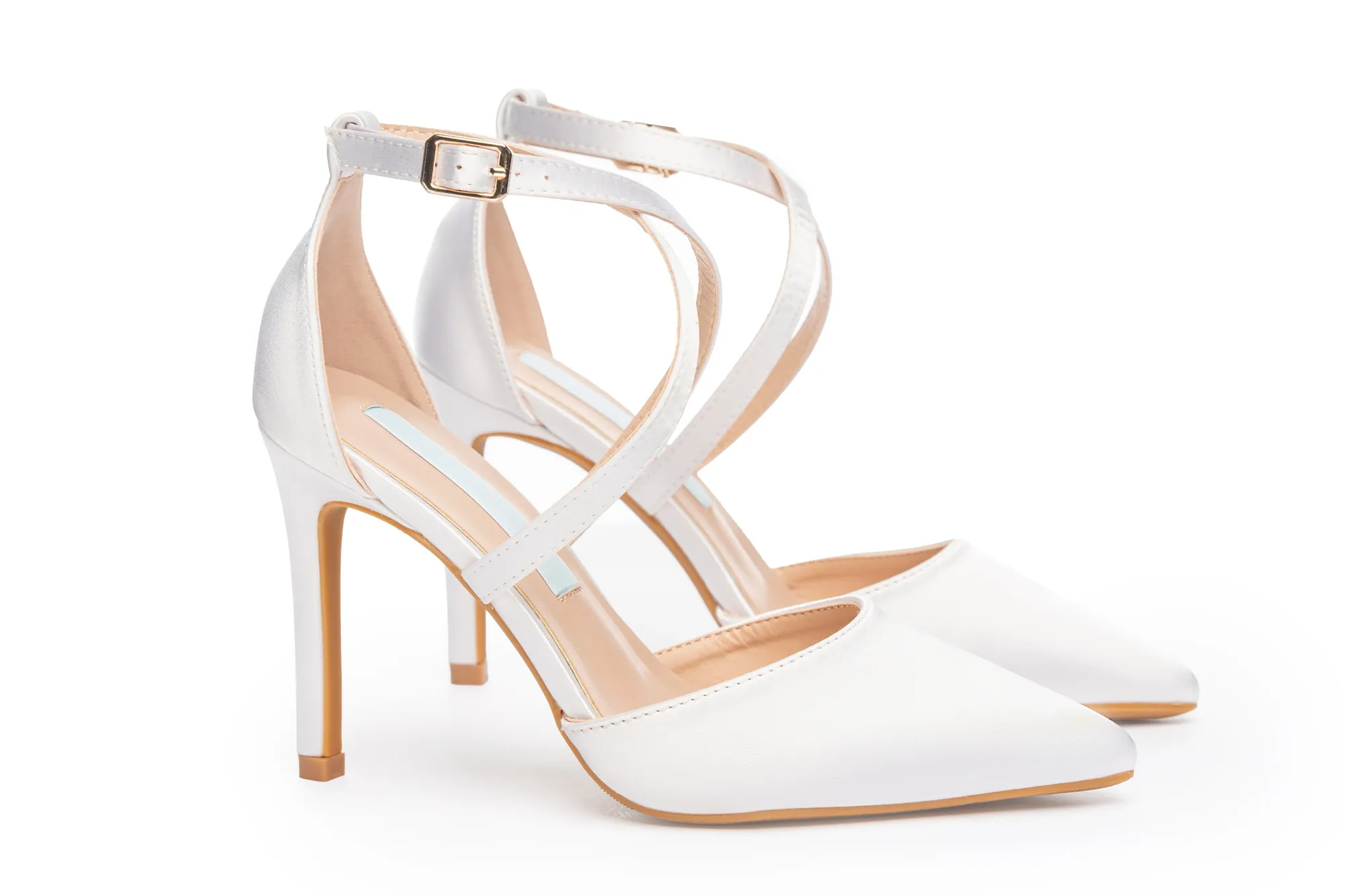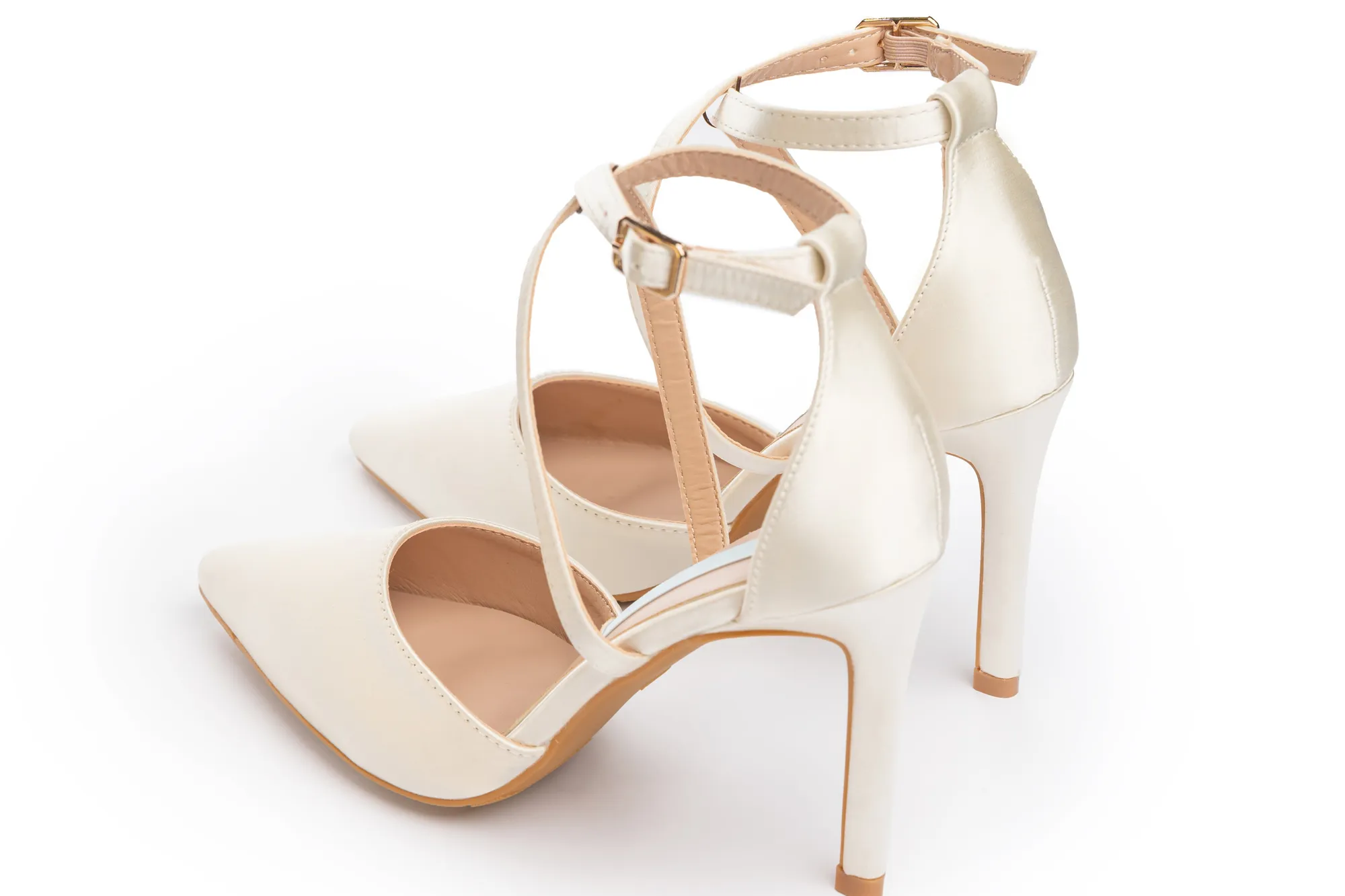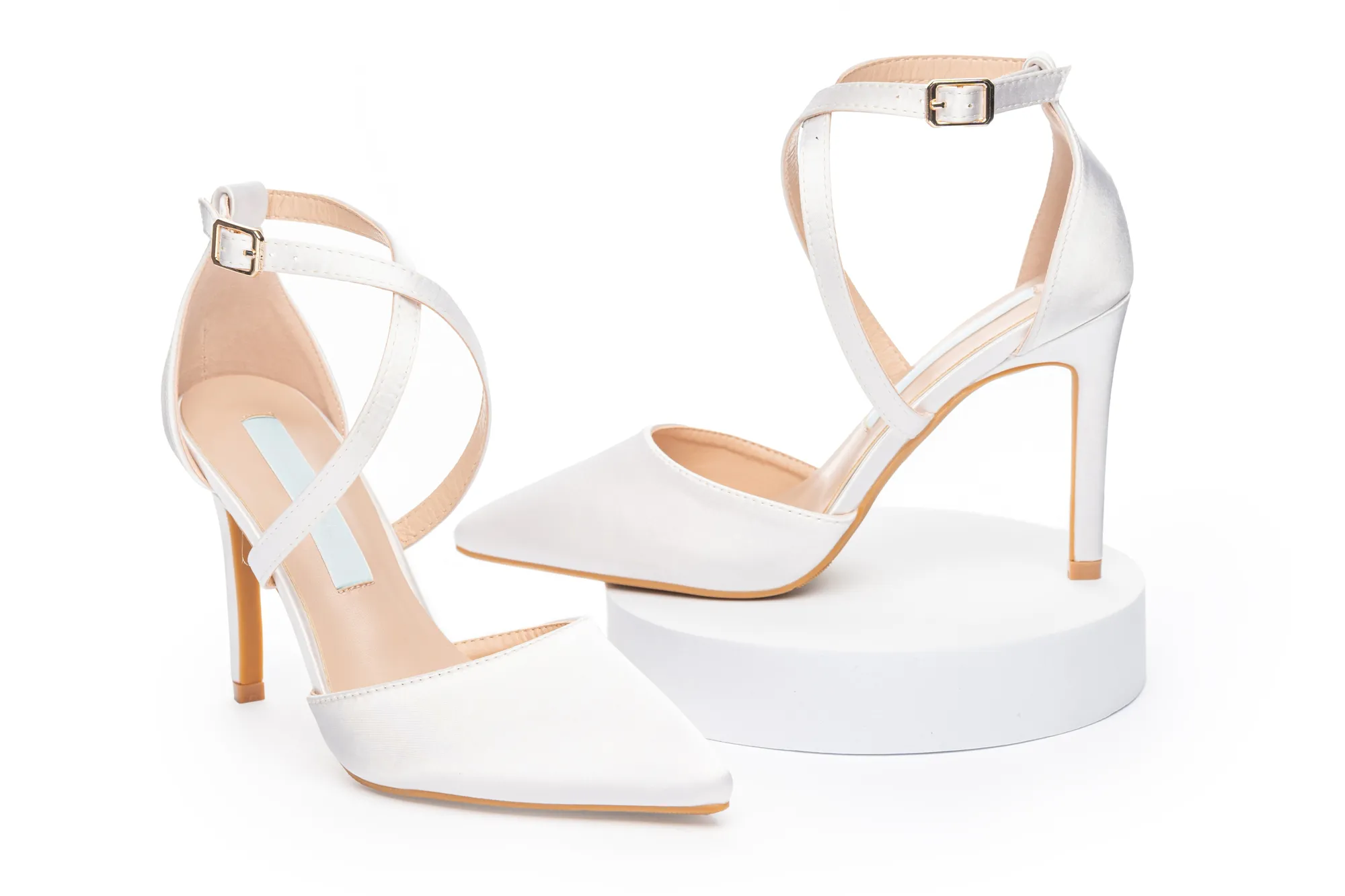 Elegant white satin wedding heels with cross ankle straps, a 3.5-inch heel, and pointed toe design. Comfortable, secure, and stylish—perfect for your walk down the aisle.
