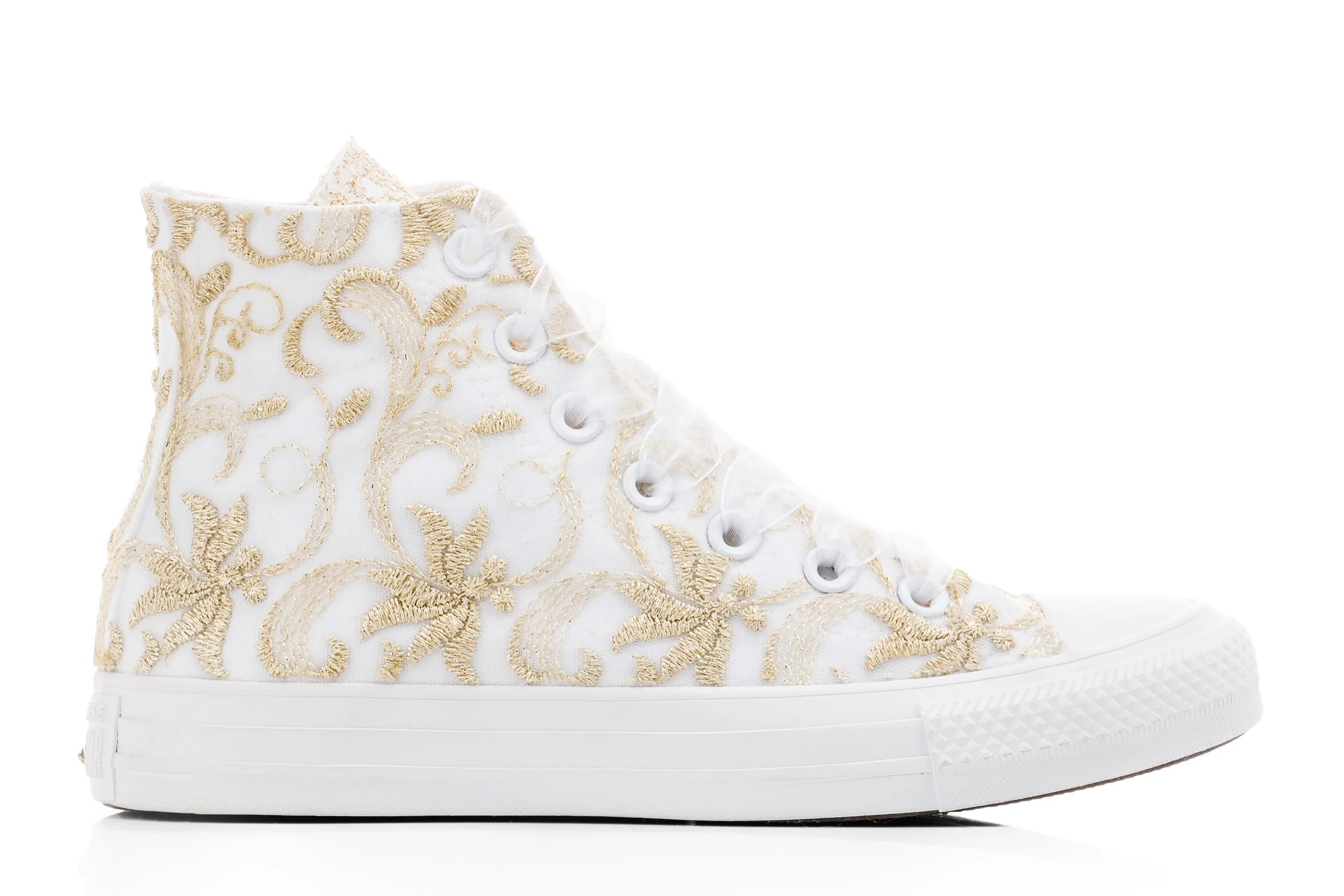 Gold bride Converse add a radiant touch to your wedding day look. Hand-decorated with gleaming gold accents, these sneakers are a bold yet elegant choice for brides who want to shine while staying comfortable from ceremony to celebration.