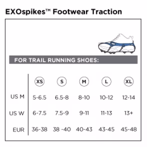 Les crampons Kahtoola EXOspikes sont extrêmement polyvalents et durables. Ils excellent tant en ville qu’en montagne. Charte de grandeurs: XS: Homme: 5-6.5 / Femme: 6-7.5 S: Homme: 6.5-8 / Femme: 7.5-9 M: Homme: 8-10 / Femme: 9-11 L: Homme: 10-12 / Femme: 11-13 XL: Homme: 12-14 / Femme: 13+