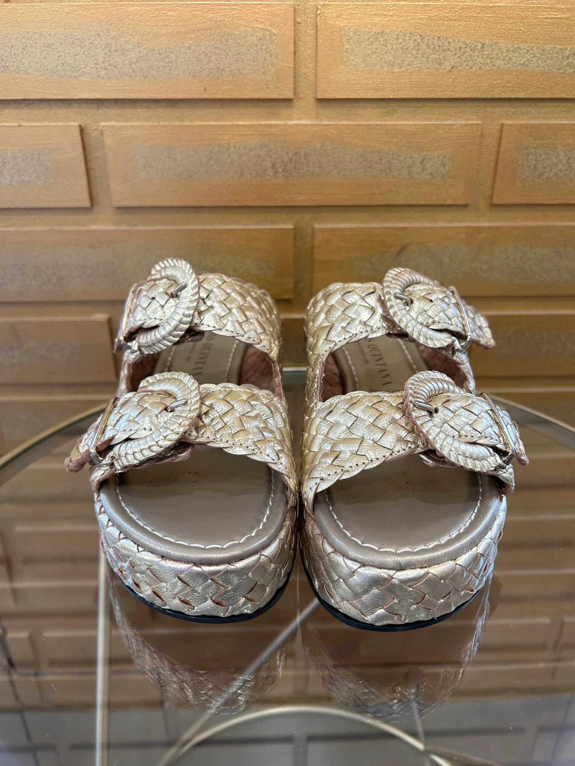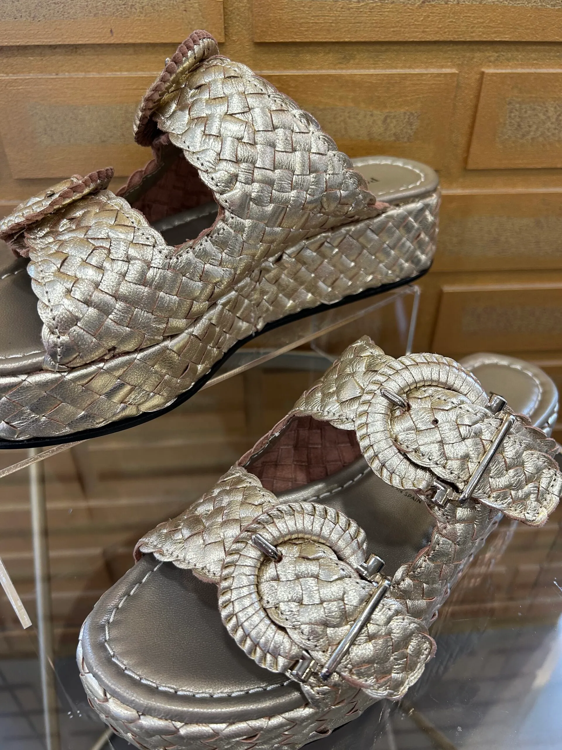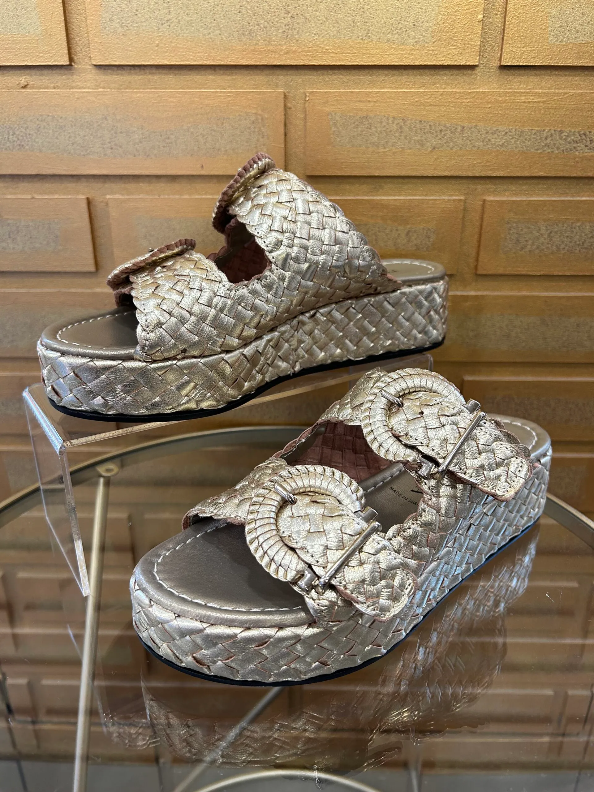 Dessus : cuir tressé à la main Intérieur : cuir Hauteur de talon : 5cm Hauteur de plateforme : 3,5cm Fabrication : Espagne