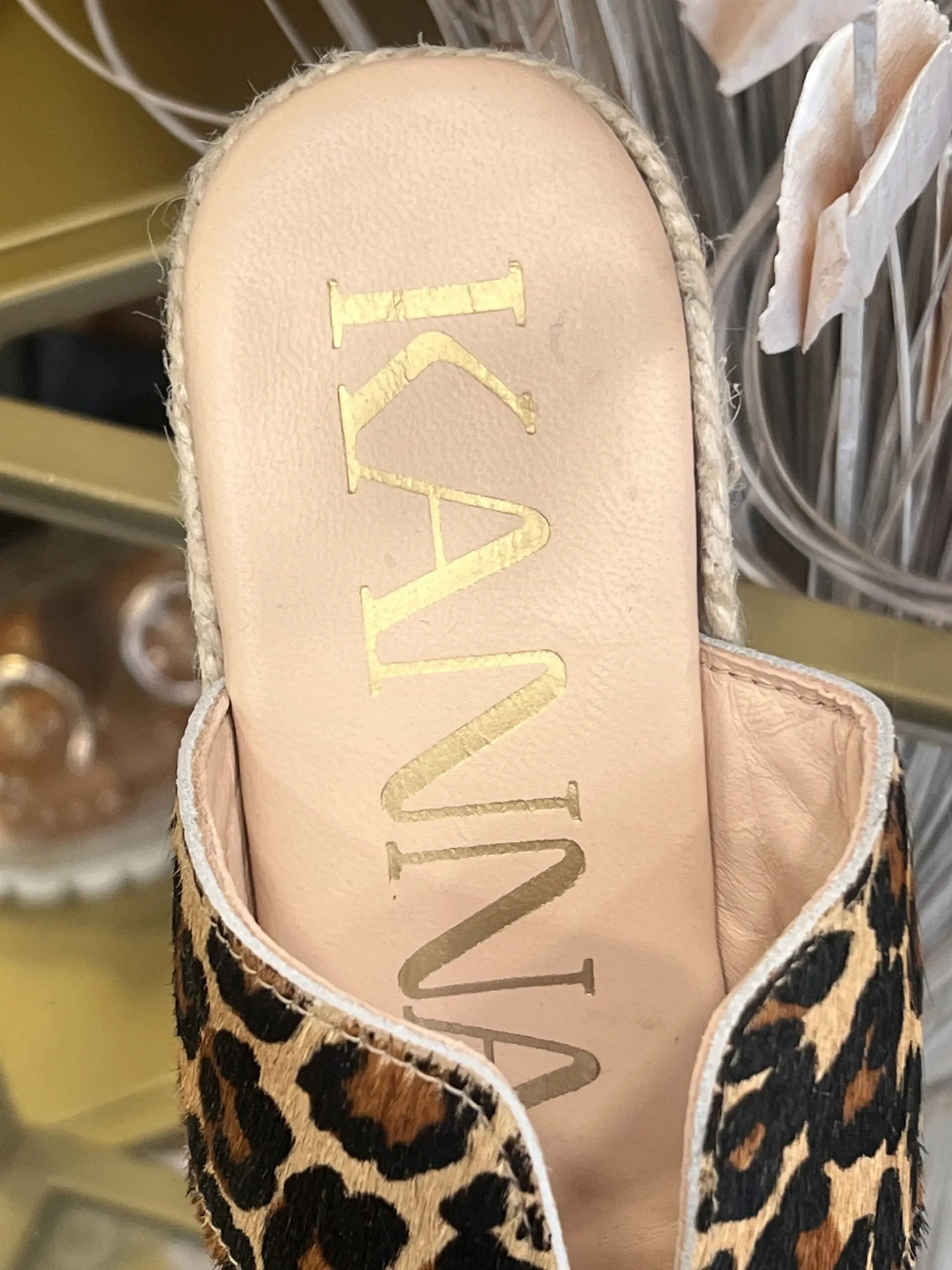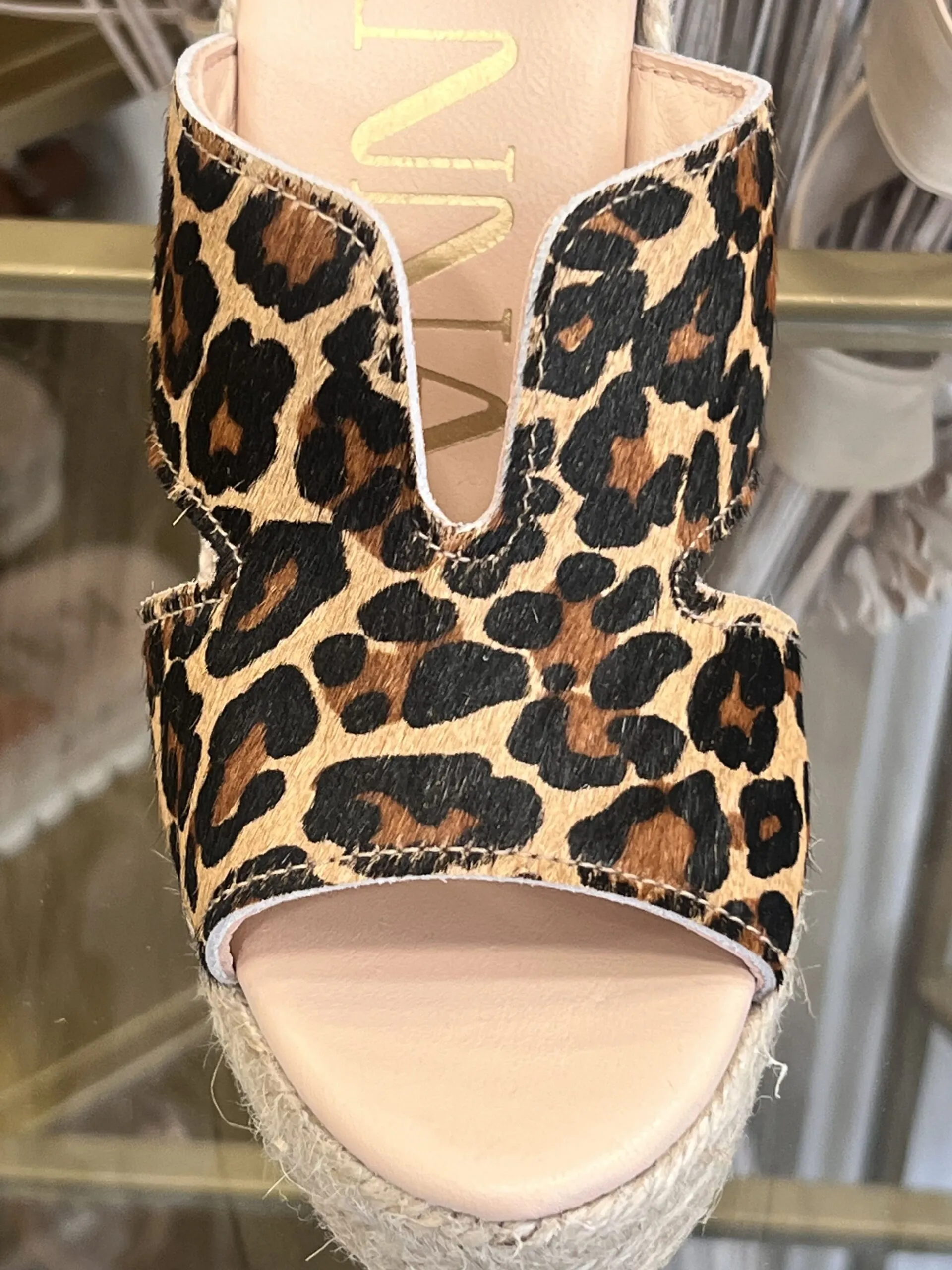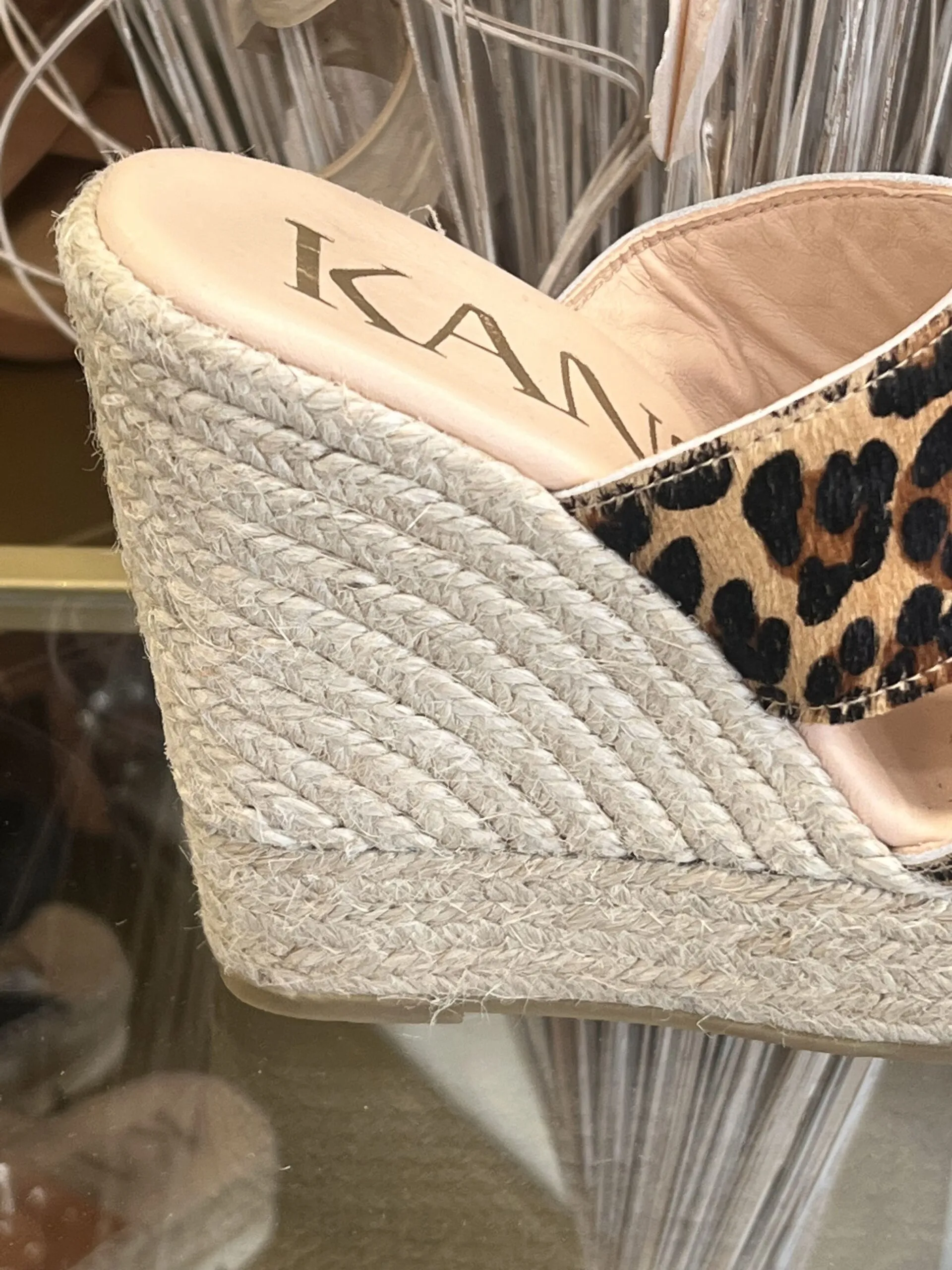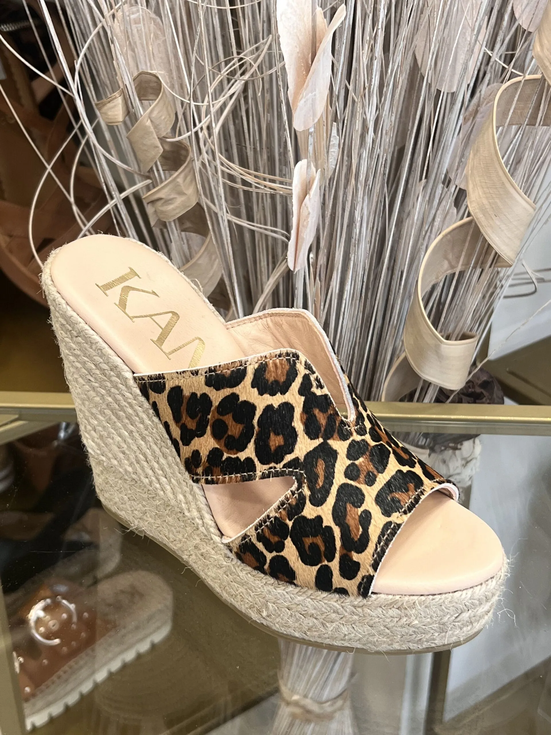 Matière : cuir véritable imprimé léopard Semelle : plateforme en corde tressée Confort : légère, ouverte, idéale pour l’été Origine : fabrication artisanale espagnole 🇪🇸 Style : bohème-chic avec une touche sauvage Talon : Hauteur talon 12 cm , plateforme avant 3 cm, Cambrure : 9 cm