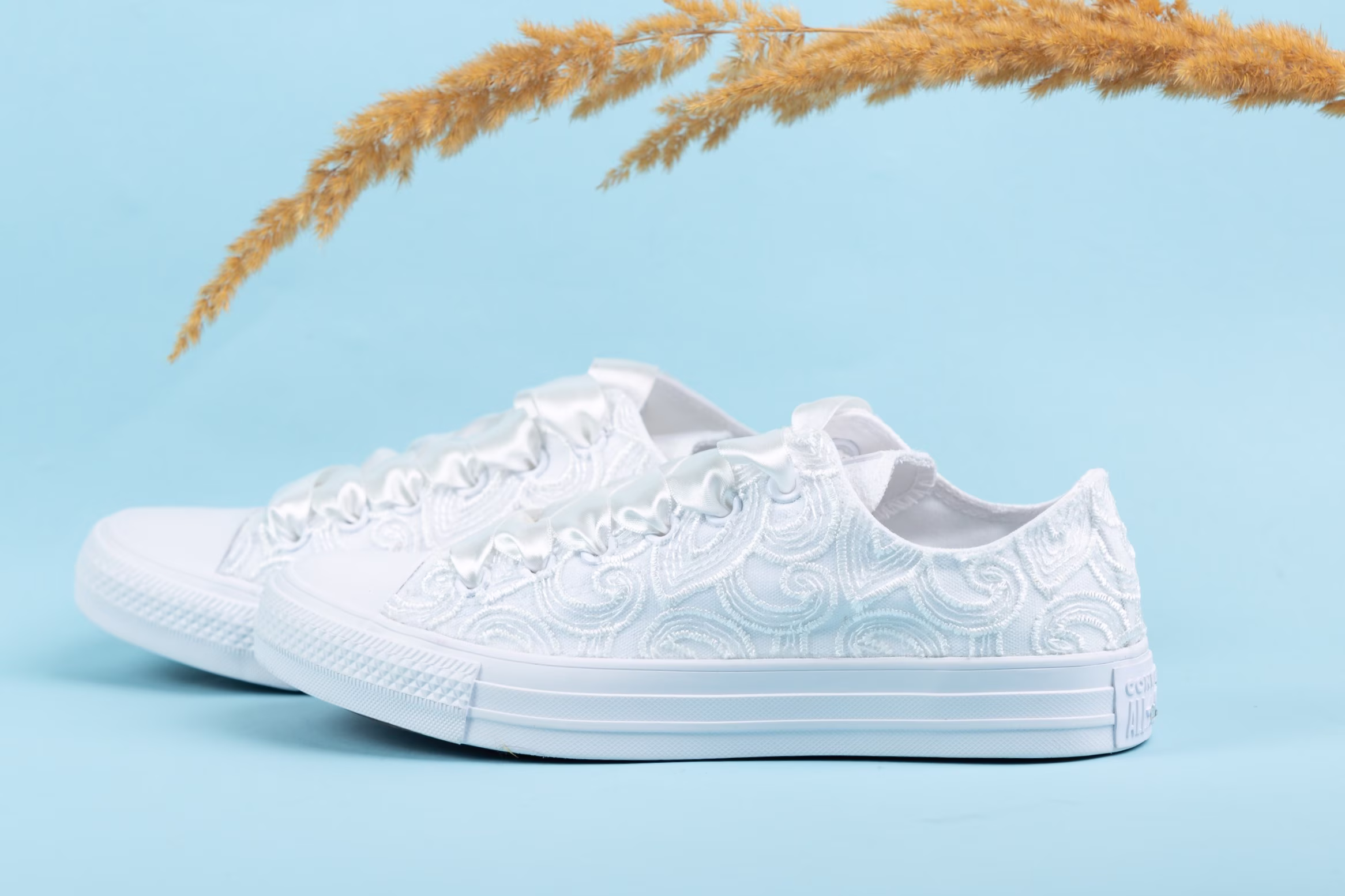 Step into your wedding day with these exquisite White Lace Converse, featuring bold leaf designs for a natural yet stylish look. These unique high-top sneakers merge classic comfort with contemporary bridal elegance, adorned with detailed lace and leaf motifs. Perfect for brides seeking a standout yet comfortable footwear option that complements a variety of wedding themes.